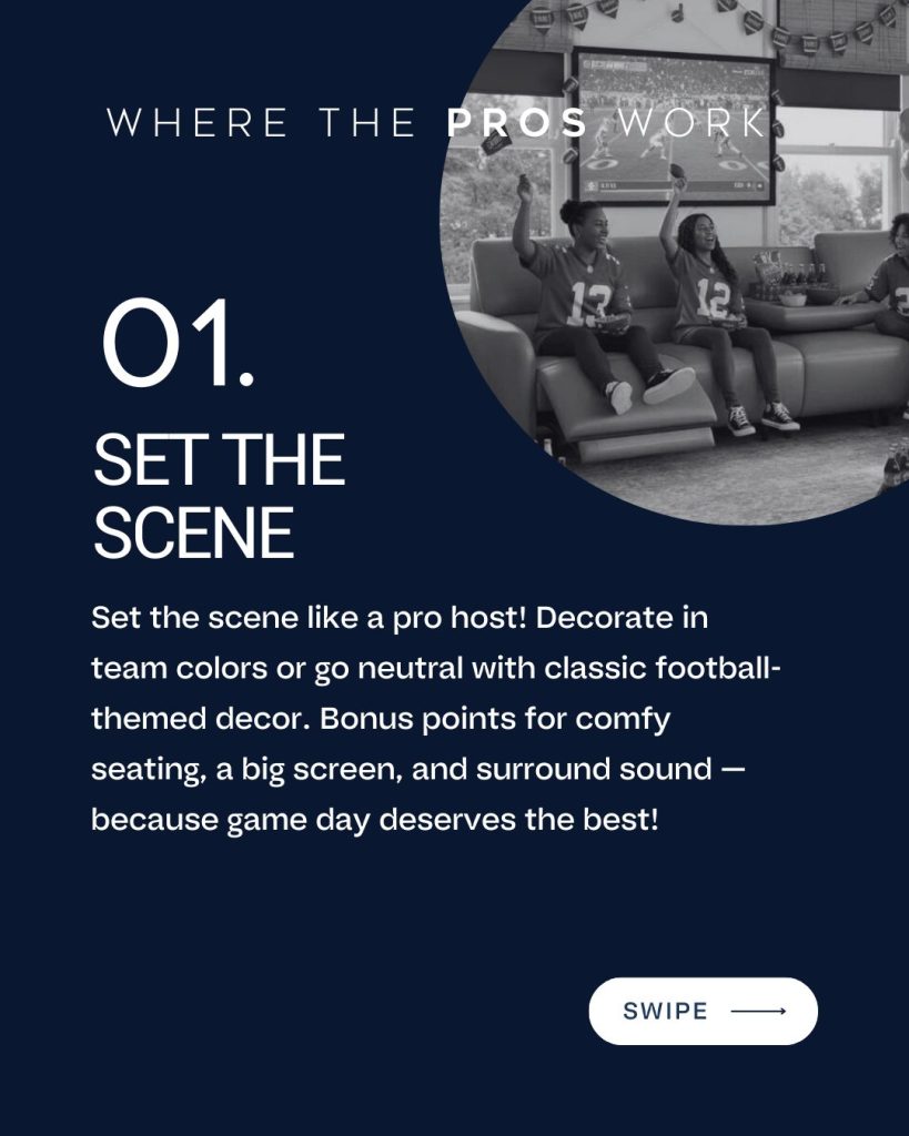 Transform your space into the ultimate home‑field advantage. Start with a layout that gives every guest a comfy spot to watch the game — cozy couches, extra chairs, and floor pillows all help maximize comfort. Arrange seating so everyone has a great view of the big screen and can easily mingle during commercials and halftime.